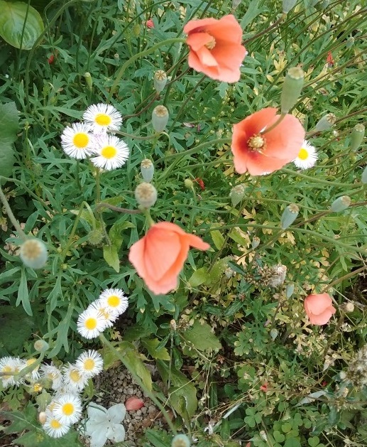 白いヒメジョオンと赤い虞美人草(ヒナゲシ、コクリコ、ポピー)