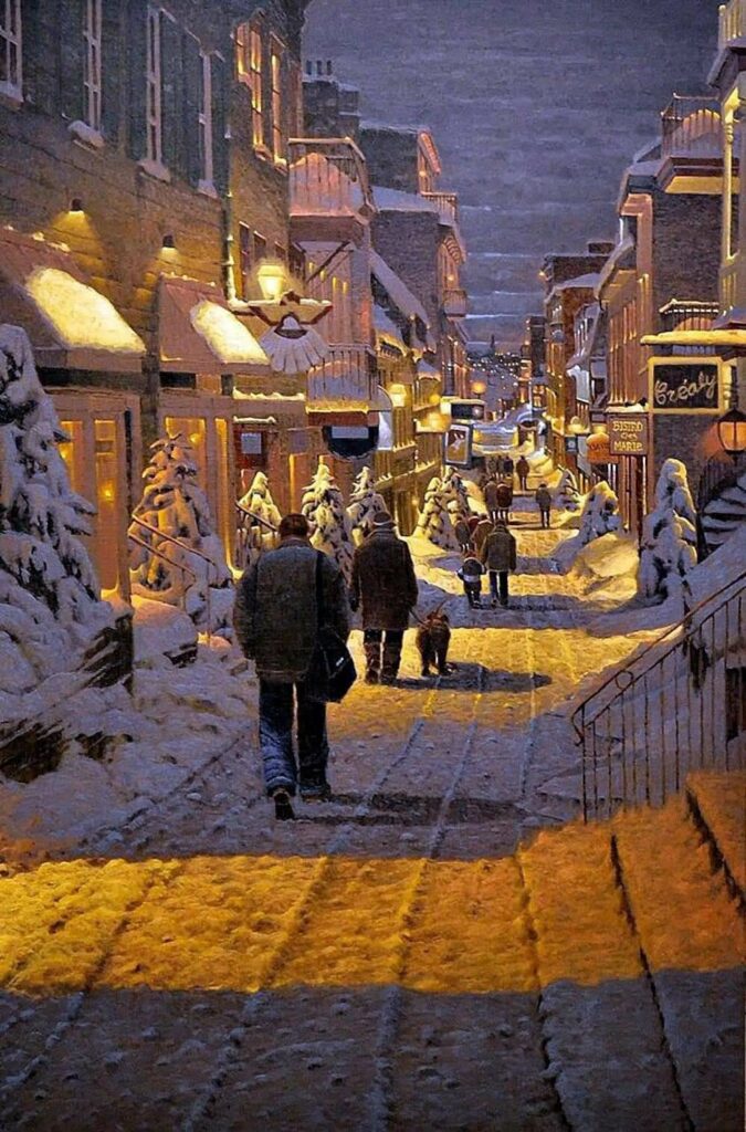 吹雪いてなければこの絵画のように、人工の灯が長い夜の街を暖かく煌びやかに変えてくれます。