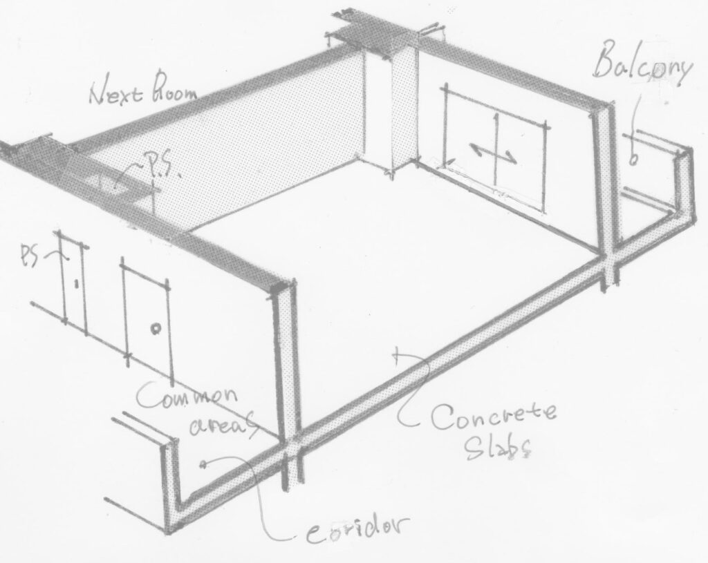 専有部分の床は下の階の天井、天井は上の階の床、壁は隣室の壁または外壁ですので、すべて共用部分です。では玄関ドアや窓サッシはなぜ共用部分なのか、6面全部コンクリートで囲ってしまうと中に入れませんね。